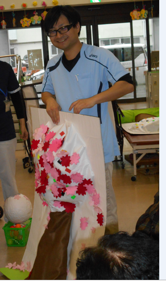 レクリエーションでは紙製のくす玉を作製しその中に手作りの桜の花びらを入れて利用者に割ってもらい桜の木を完成させるレクを行いました。
