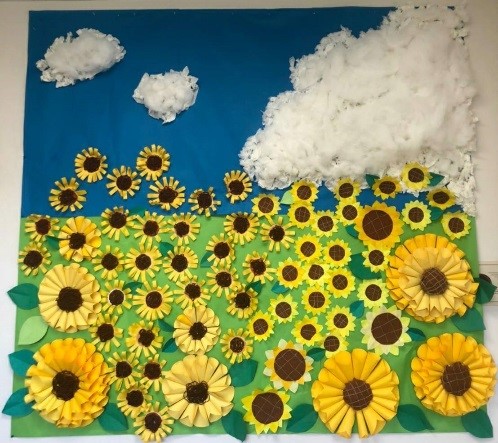 折り紙・画用紙・紐テープを使った3種類のひまわりを作りました。