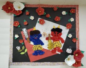 赤鬼と青鬼、椿の花を組み合わせた壁画を作りました。