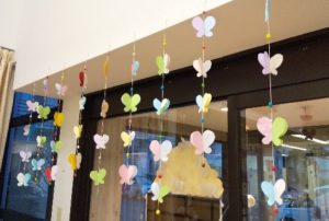 満開のお花畑の壁画を作りました。オーナメントは色鮮やかな蝶々を作りとても華やかになりました。