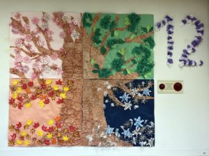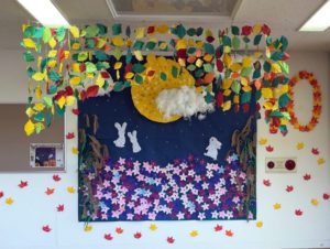 十五夜をテーマにした作品です。大きなお月様が立体的に見えるように貼り方にもこだわりました。