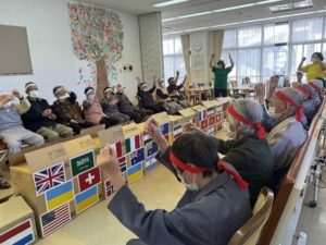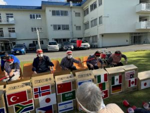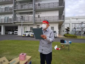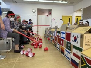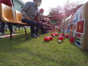 今年の競技は、棒を使ってカップをすくい上げ、目の前の国境(段ボール)を越えるゲームを皆さんに行ってもらいました。皆さんとても真剣で、紅白に分かれて、とてもいい勝負となりました!