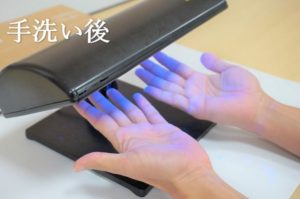 感染予防用品を取り扱う医薬品メーカーの東京サラヤ株式会社様よりご協力いただき、手洗いチェッカーとブラックライトを使用した研修を実施しました。専用ローションを汚れに見立てて塗り、手洗い後、特殊ライトの下に手をかざすと洗い残しが光ります。