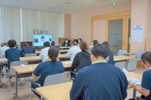 今回は各委員会の研修と、今年度より特定技能1号という在留資格で採用となった、ミャンマーの外国人介護職員2名との交流会を行いました。