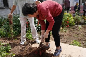 爽やかな秋晴れの下、A館1階でさつまいもを収穫しました。