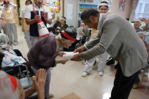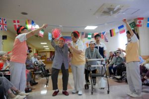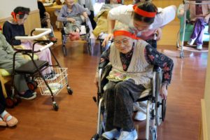 玉入れ、大玉転がし、借り物競走、ジュースやお菓子取り競走などの競技を行い、選手と応援団で利用者全員で楽しみました。