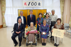 満百歳となる方には、それぞれ記念品や花束、内閣総理大臣からの祝い状及び銀杯が贈呈され、ご家族様、ご利用者、職員が式に参列し、長寿をお祝いしました。