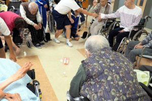 風船バレー・リングリレー・玉入れの3つのゲームを、2チームに分かれて対抗戦で盛り上がりました。