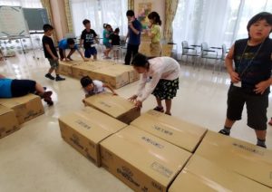 また、言葉を使わないジェスチャーゲームでは体いっぱい動かしお題を表現していました。災害体験は簡易段ボールベットの作成を各班でおこないました。子供たちや大人が寝ても壊れないことにびっくりしていました。