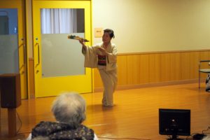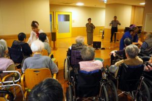 2019.11.28イベント 演芸ボランティアの方が来てくださいました 11月26日にみどり会のみなさんが演芸ボランティアで来所してくださいました。「銀座カンカン娘」「瀬戸の花嫁」など10曲を披露していただき、楽しいひと時を過ごすことができました。