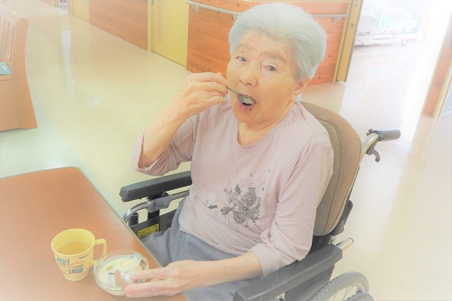 フルーツやプリンを調理員が盛り付け、利用者の皆様の目の前で介護職員がアイスやホイップクリームをトッピング!