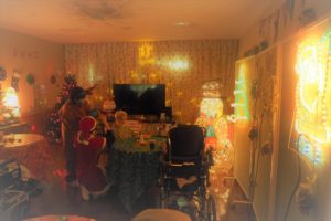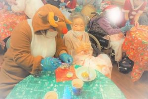 介護課はイルミネーション点灯式を今年初めて取り入れ、皆でカウントダウンし、イルミネーションが一斉に点灯すると、皆様から「うわー!綺麗ね!」と歓声が!