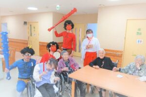 本日は節分行事として、鬼が各フロアをまわり、利用者の皆さんと豆まきを楽しみました。