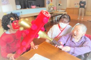突然の鬼の登場に驚きつつも、皆さん笑顔で「鬼は外!福は内!」と元気な声を響かせてくださいました。