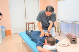 また、治療体験で腰痛のある職員を対象に施術をしていただき、日頃からできる腰痛予防や痛みがあるときのセルフケア方法等を教えていただきました。